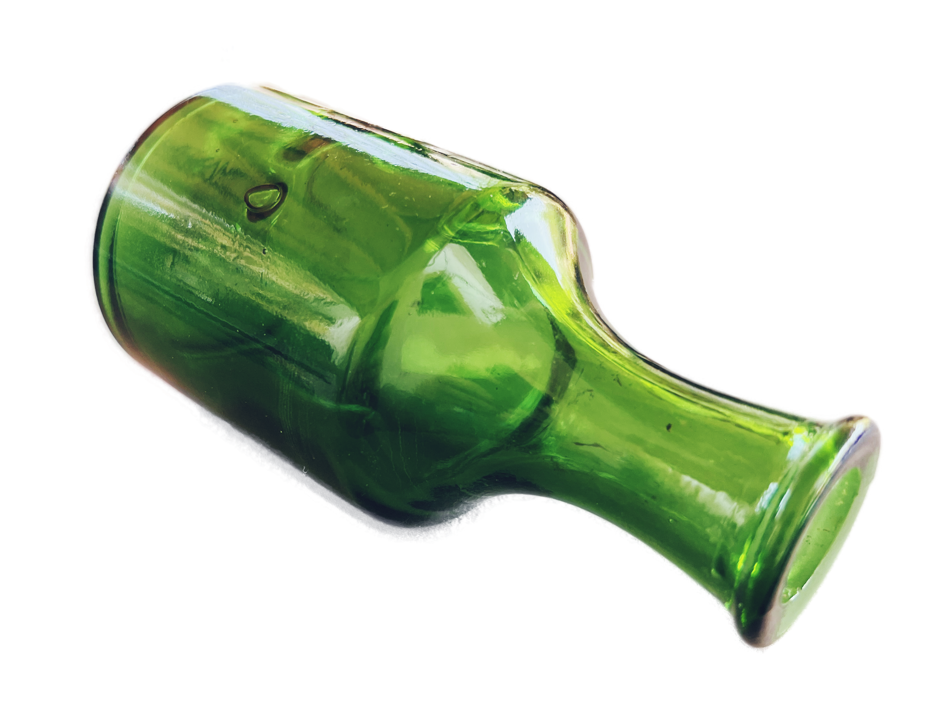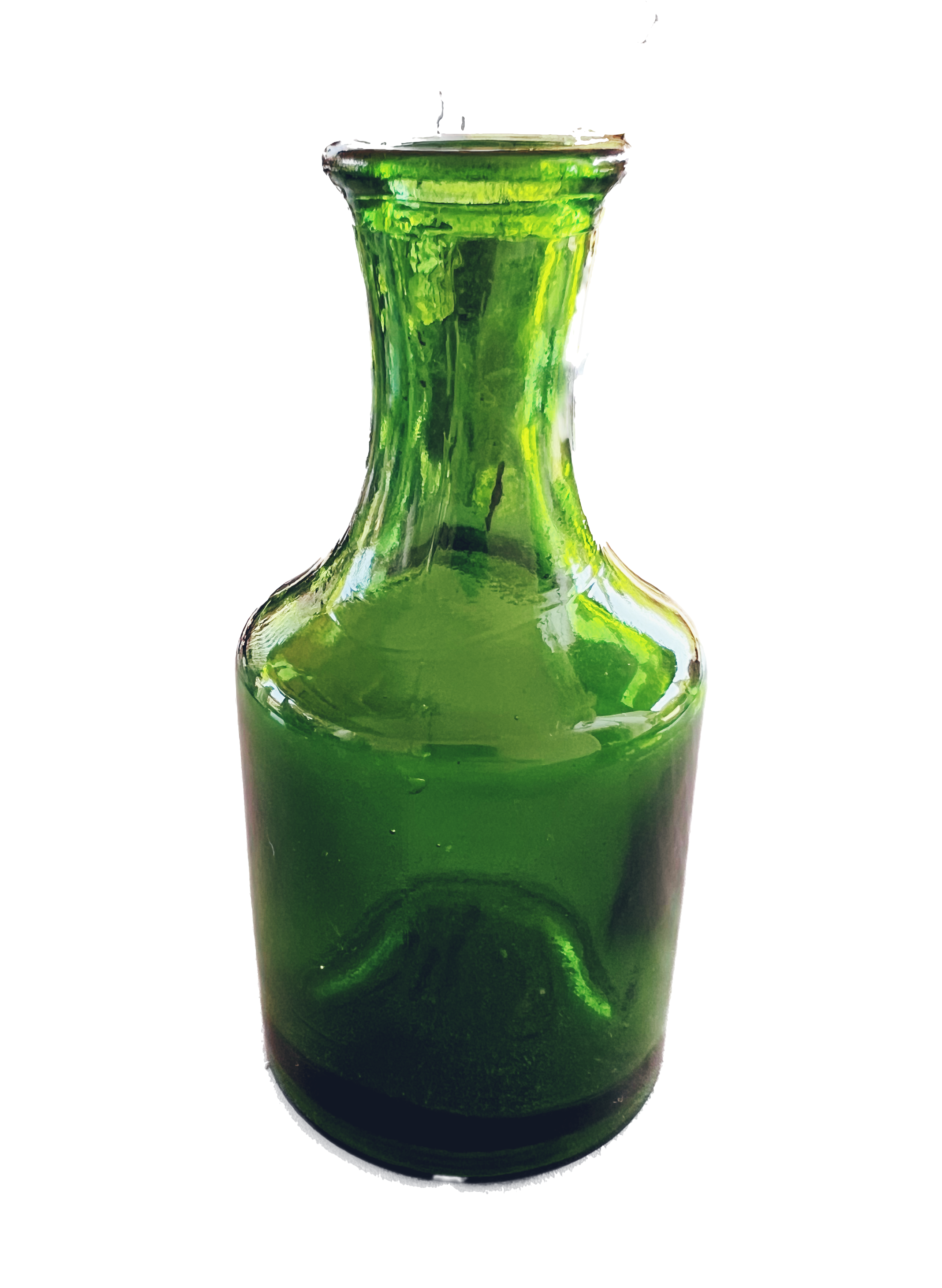Diese kräftig grüne Glasflasche besticht durch ihre dickwandige Verarbeitung und die elegante, weit auslaufende Halsform. Auffällig ist der stabile Boden mit eingelassener Wölbung, was auf eine Herstellung in einer traditionellen Glashütte hindeutet. Der leicht unregelmäßige Rand und Lufteinschlüsse im Glas sprechen für ein mundgeblasenes Verfahren. Der Stil und die Farbwahl deuten auf eine Entstehung im mittleren 20. Jahrhundert hin – möglicherweise aus dem mitteleuropäischen Raum.
