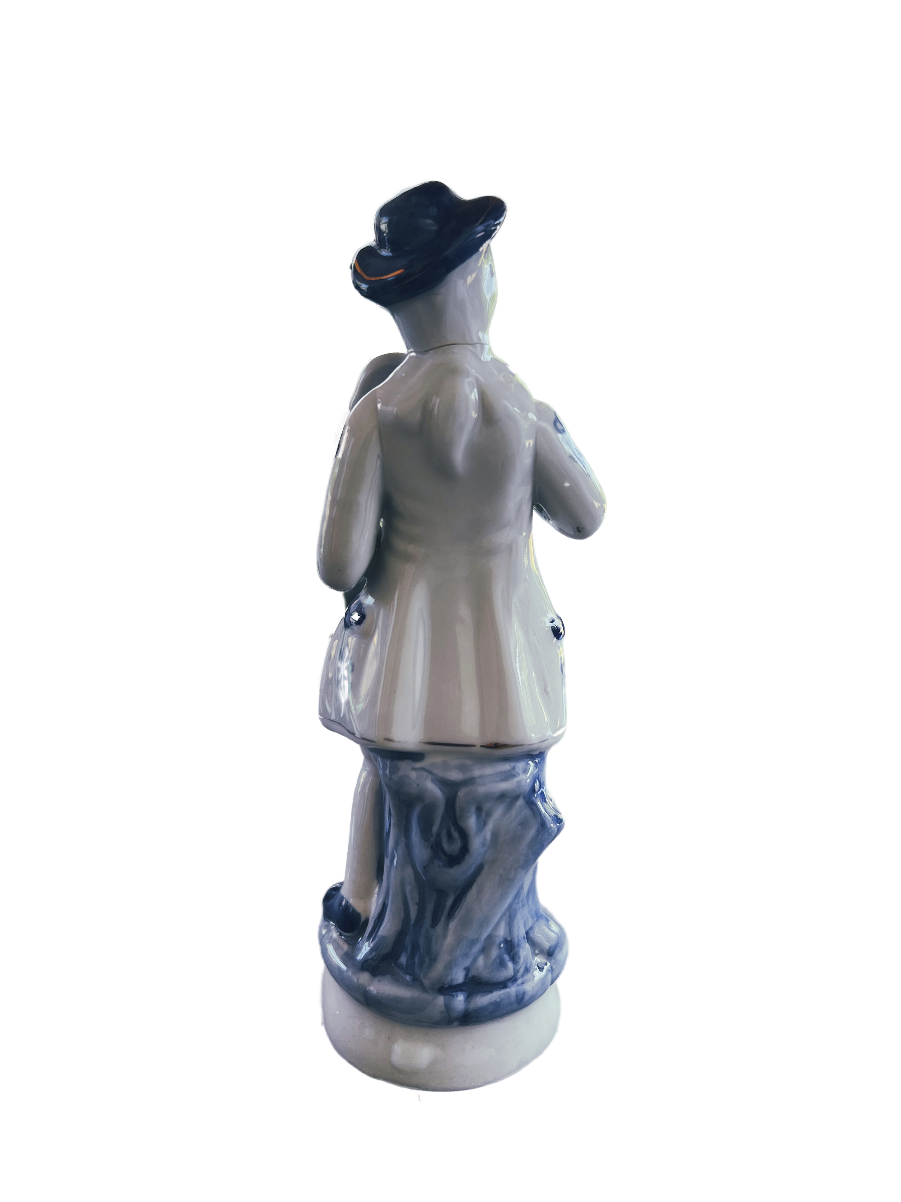 Detailreich gestaltete Porzellanfigur eines musizierenden Jungen mit Geige, gefertigt in klassischer Anmutung. Die Figur ist handbemalt in intensivem Kobaltblau mit feiner Goldstaffage und steht auf einem reliefierten Sockel mit floralen und baumähnlichen Elementen.